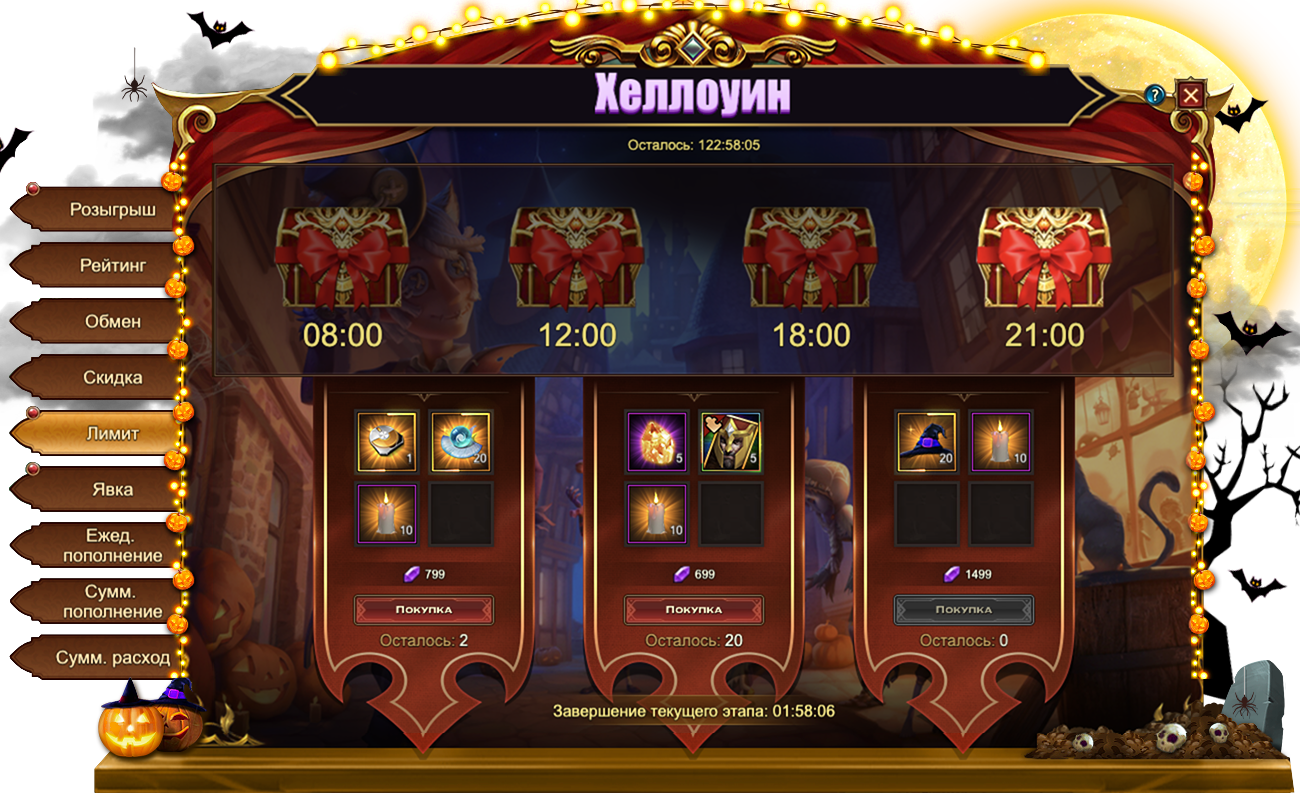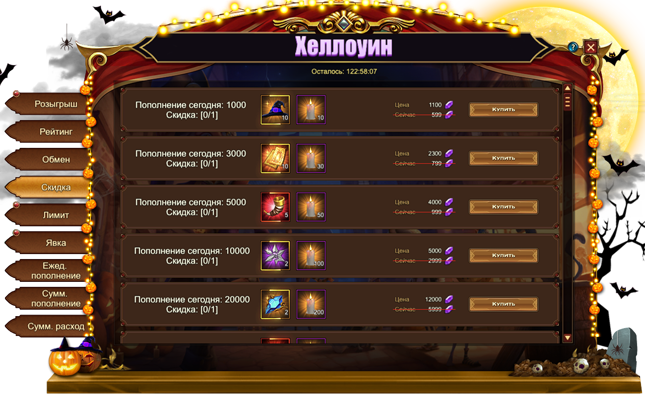 Обратите внимание, для активации скидки необходимо выполнить условие из первого столбца. Например, на скриншоте ниже, для приобретения со скидкой набора из 10 Ведьминых шляп и 10 Свечей необходимо пополнить счет на 1000.