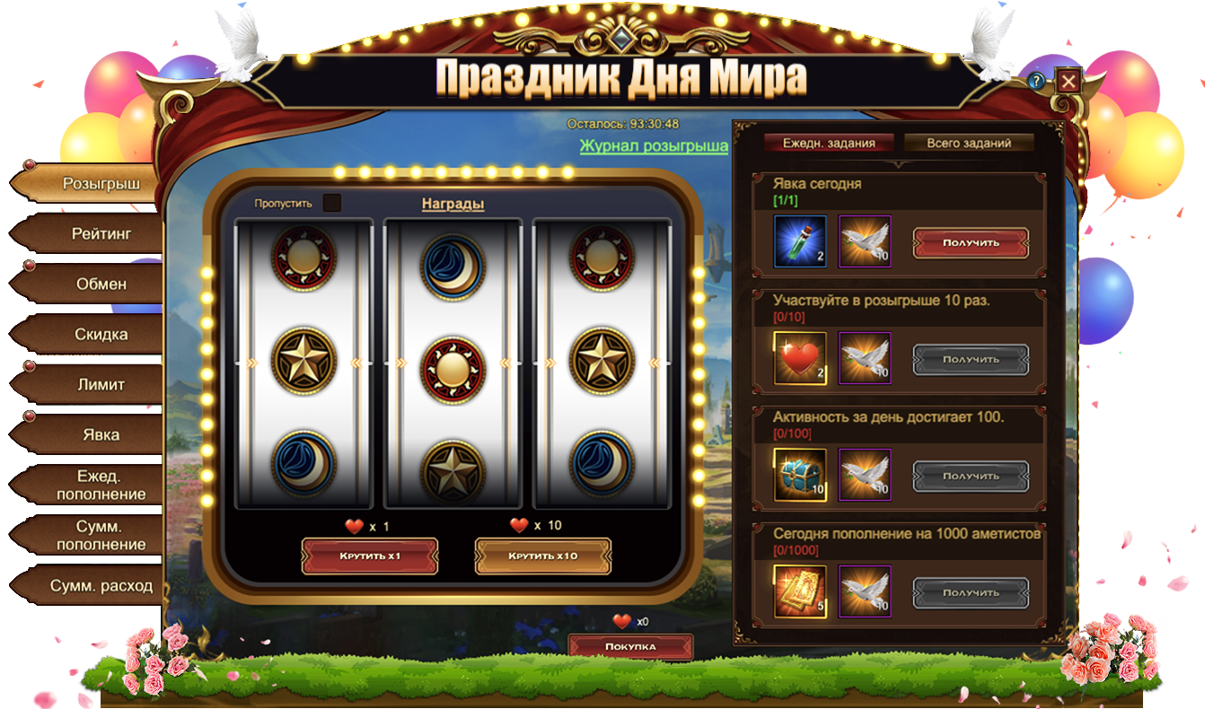 За пополнение счета на определенное количество аметистов за один день, вы можете получить: Изумруд, Сундук кристаллов 5 ур., Сундук самоцветов 6 ур., Сундук камней элементаля 4 ур., Голубь мираЖетон дня мира, Сундук книг навыковСундук кристаллов 7 ур., Дух крыльев святости, Сундук кристаллов 9 ур., Оранжевое созвездие, Сундук снаряжения героя (оранж.), Сущность артефактаСундук редкостей, Письмо с молитвой, Фрагмент паровой стрекозы, Эмблема величия, [Фрагмент карты] Тюр.