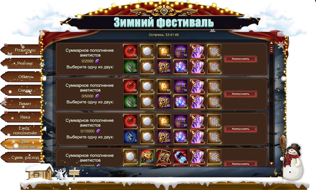 За пополнение счета на определенное количество аметистов за один день, вы можете получить: Изумруд, Сундук кристаллов 6 ур., Сундук камней элементаля 4 ур., Снежок, Снежинка, Цитрин, Сундук карт SSR, Сундук кристаллов 9 ур., Сундук самоцветов 7 ур., Сундук книг Навыков, Солнечный камень души, Сущность артефакта, Сундук редкостей, Фрагмент осуждения преступлений, Сундук с кодексом, Красное созвездие, Сундук снаряжения героя (красн.)[Фрагмент карты] Тюр.