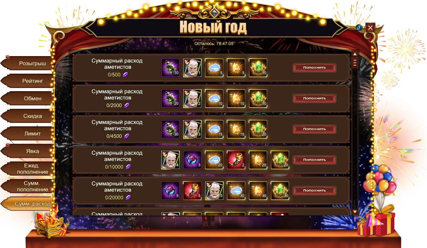 За пополнение счета на определенное количество аметистов за один день, вы можете получить: Сундук кристаллов 6 ур., Сундук камней элементаля 4 ур., Лунный камень души, Шарики, Коробка сюрпризов, Камень повышения героя, Сундук карт SSR, Сундук книг навыков, Сундук кристаллов 9 ур., Сундук самоцветов 7 ур., Сущность артефактаСундук редкостей, Фрагмент Ледяных крыльев, Письмо с молитвой, Сундук с кодексом, Красное созвездие, Сундук снаряжения героя (красн.)[Фрагмент карты] Тюр.