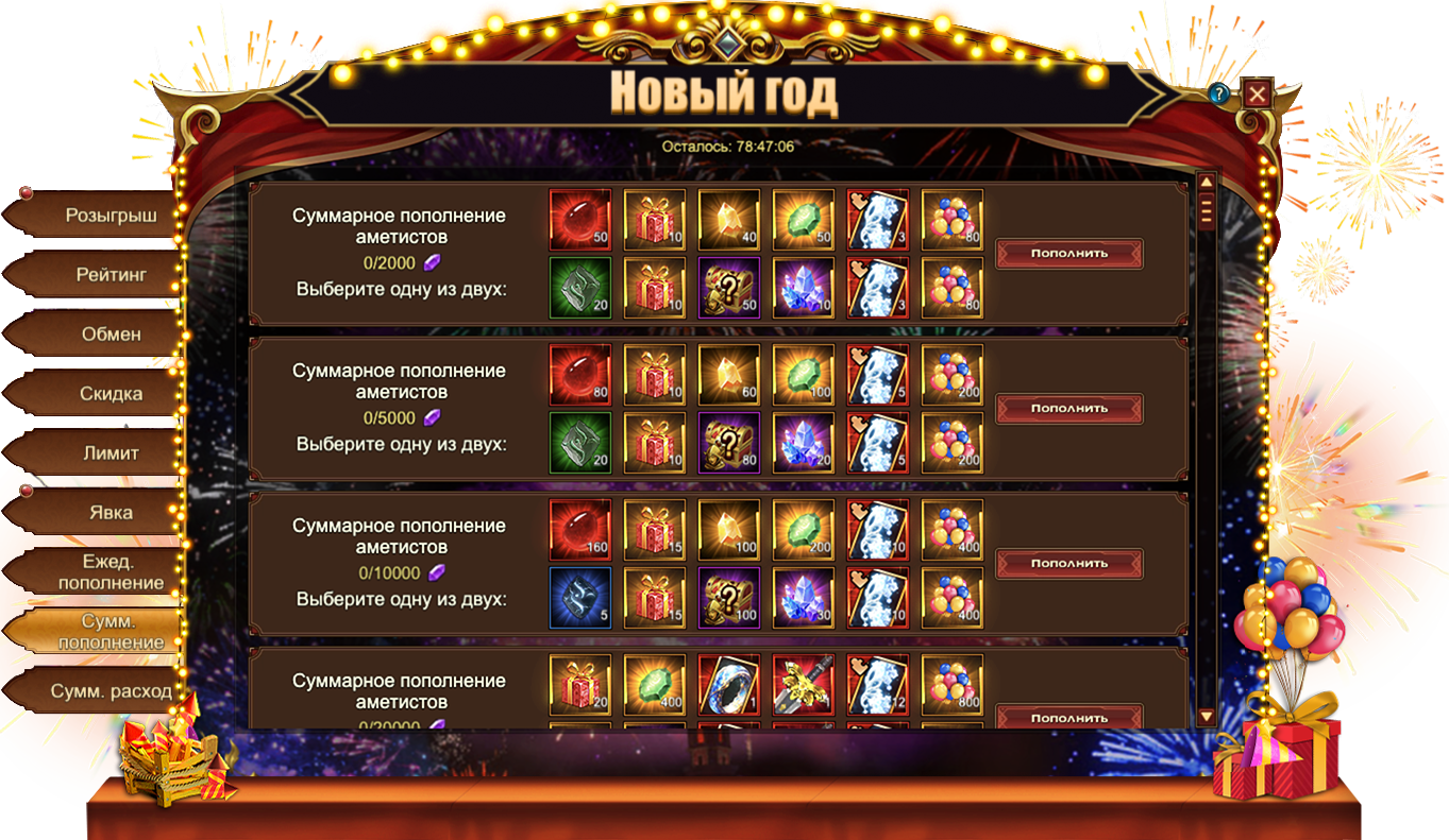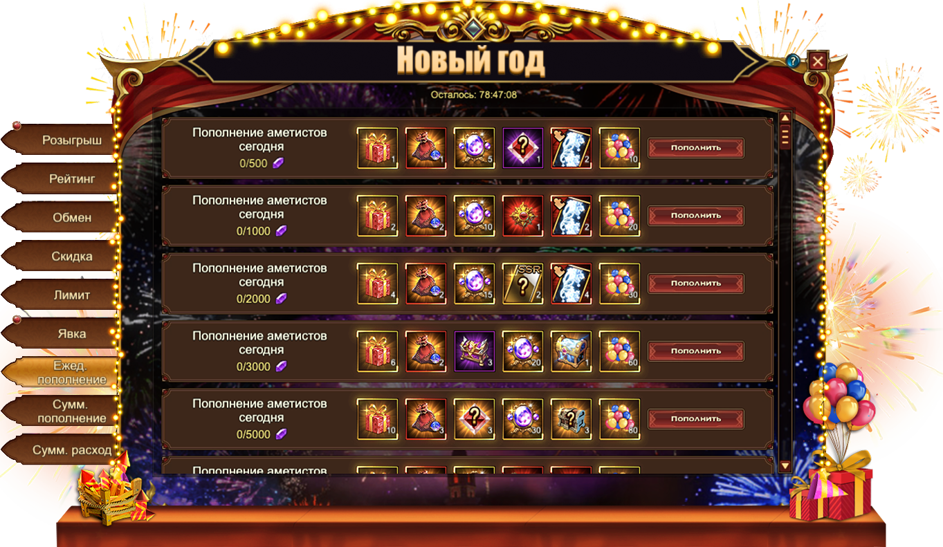 За пополнение счета на определенное количество аметистов за один день, вы можете получить: Сундук кристаллов 6 ур., Сундук камней элементаля 4 ур., Лунный камень души, Шарики, Коробка сюрпризов, Камень повышения героя, Сундук карт SSR, Сундук книг навыков, Сундук кристаллов 9 ур., Сундук самоцветов 7 ур., Сущность артефактаСундук редкостей, Фрагмент Ледяных крыльев, Письмо с молитвой, Сундук с кодексом, Красное созвездие, Сундук снаряжения героя (красн.)[Фрагмент карты] Тюр.
