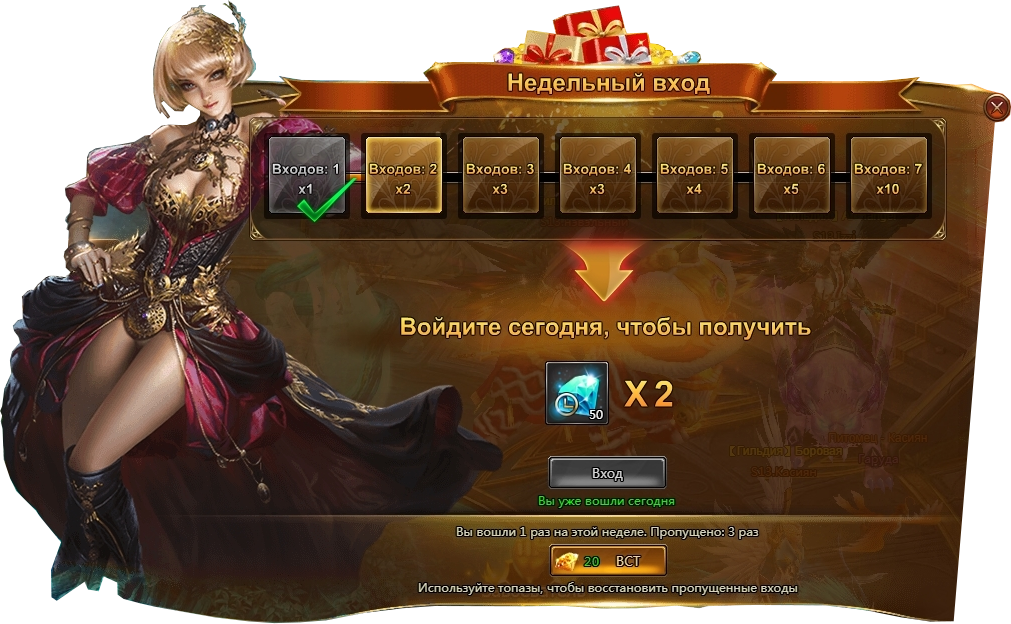 Чекинтесь каждый день у добронравной Доры, чтобы получить до 500 Фианитов! Всего за неделю модно получить 1250 Фианитов.