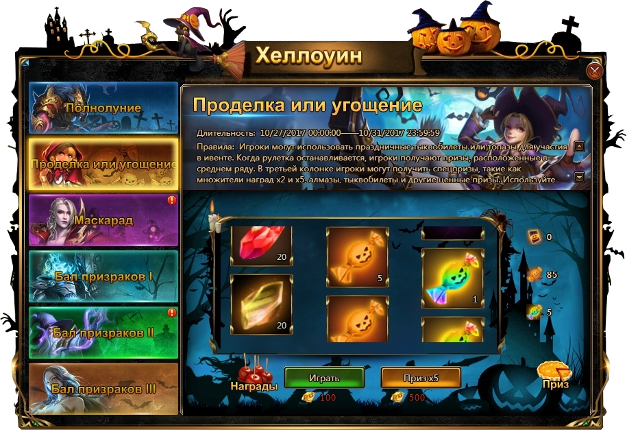 Помимо обычным конфет, вы можете получить особенные Волшебные конфеты, которые значительно ценнее фруктовых. Получить их можно на вкладке «Проделка или угощение», а билеты на него достать в Событиях. Также, когда билеты кончаться, покупать попытки можно за Топазы.