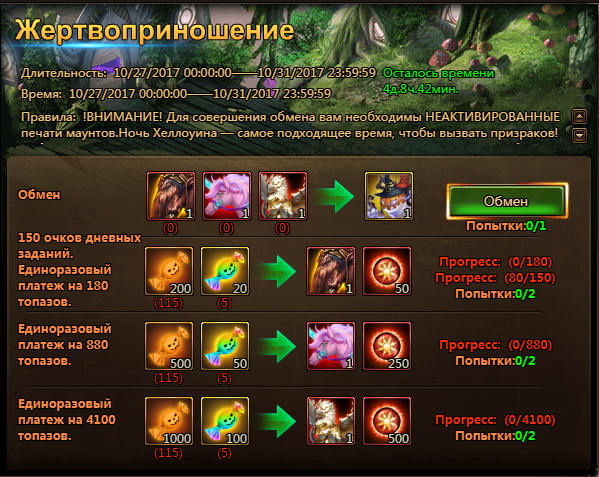 Жертвоприношение: Чтобы получить Полтергейста, нужно "принести в жертву" покровителям Хэллоуина Бриенну, Боевого Мамонта и Буревого грифона (!ВНИМАНИЕ! Маунты должны быть неактивированы и оставаться в виде печатей). Этой платы хватит, чтобы Полтергейст служит вам до конца времен.