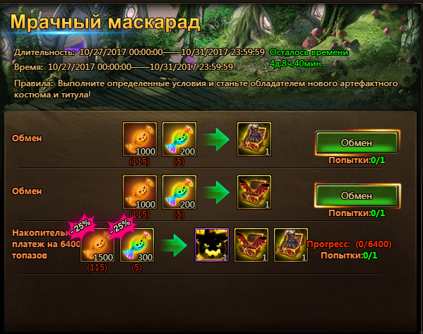 Мрачный маскарад:чтобы получить новый хэллоуинский костюм и крылья, нужно накопить определенное количество Конфет. Также, можно воспользоваться бонусом накопительного платежа, и купить костюи крылья со скидкой, а впридачу получить еще и уникальный хэллоуинский титул.