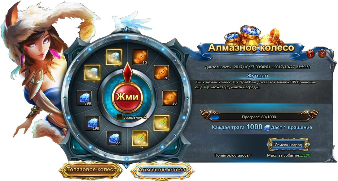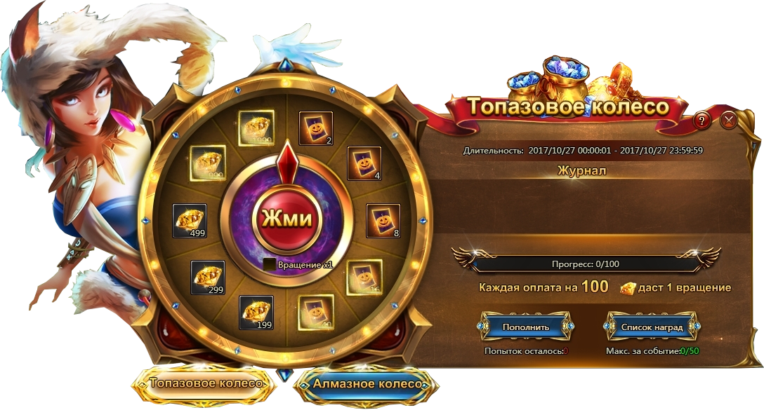Попытки Топазового Колеса можно получить за каждые 100 пополняемых Топазов. При этом, самый минимальный приз в Колесе — 199 Топазов или 2 хэллоуинских билета. Говоря проще, ваше пополнение за счет игры в Эльдорадо увеличится как минимум в три раза. Звучит неплохо!