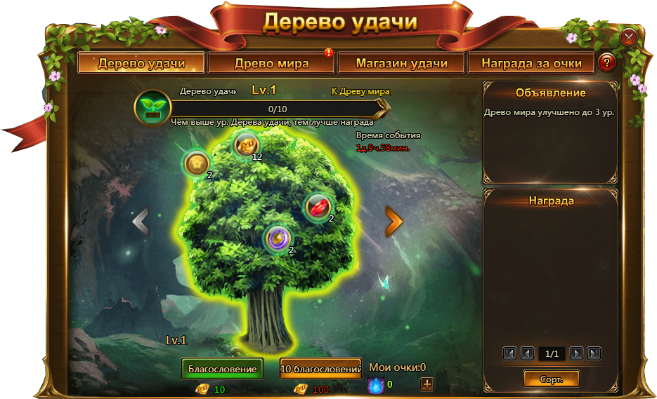 Дерево мира всегда играло большую роль в жизни Элизиума. Почти уничтоженное во время Войны Хаоса, оно было восстановлено и теперь приносит жителям планеты только счастье и радость! Правила простые — для паломничества к дереву нужна Водная эссенция, которую можно купить за Алмазы или получить за определенные события. За Водную эссенцию дерево будет одаривать вас подарками, самые яркие из которых — Топазы.