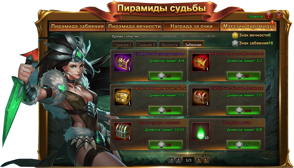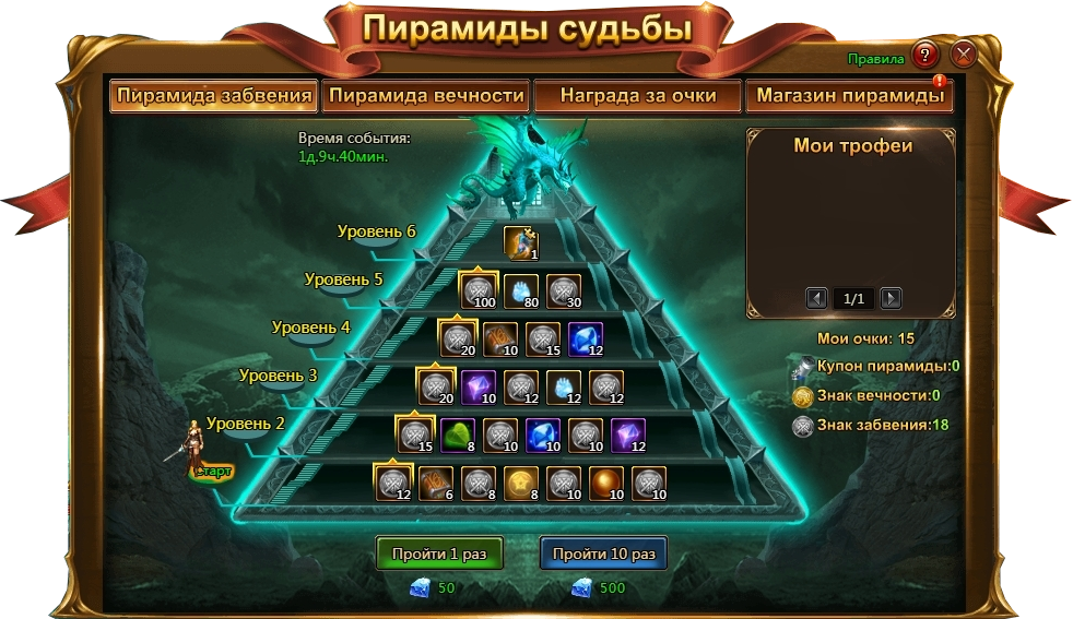 За каждый поиск вы получаете один приз из возможных на этом этаже. Если попадете на крайний слева — перейдете на следующий этаж. После достижения вершины, покорение начнется сначала. В ходе восхождения вы будете получать не только указанные призы, но еще и Знаки вечности и забвения, которые потом можно обменять на разнообразные призы в Магазине пирамиды.