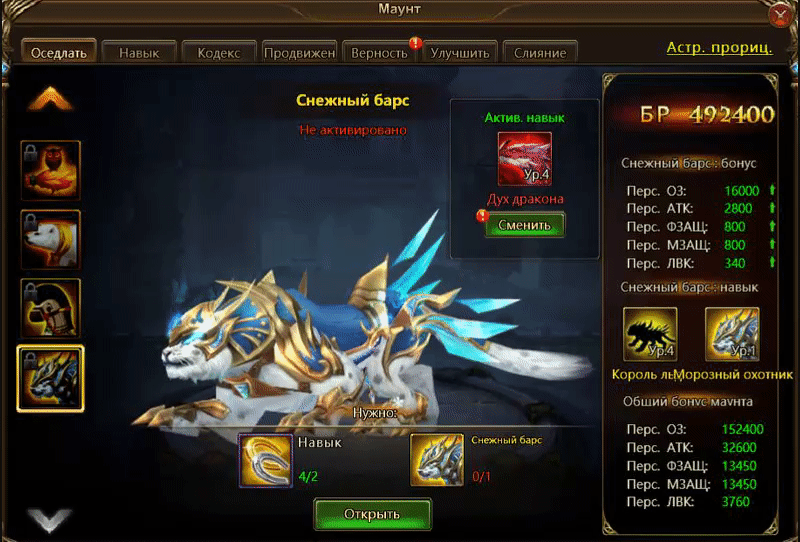 Уникальный устойчивый к холоду ловкий, сильный и быстрый «Снежный Барс» даст вам немаленькие бонусы к характеристикам и поможет победить самых опасных врагов.