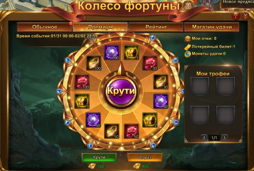 Герои, самое время забрать свои призы, испытав удачу в волшебном событии «Колесо фортуны». С 31 января по 2 февраля участвуйте в Ивенте и выигрывайте ценные ресурсы — солнечники, фиолетовые нефриты, сундуки слияния питомцев, камни крови. В магазине удачи вы найдете печати призыва ангельских маунтов и артефактные сундуки.