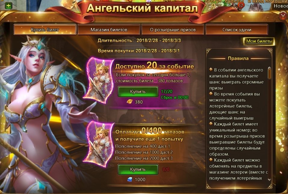 с 28 февраля по 1 марта будет доступно событие «Ангельский капитал». Приобретайте золотые билеты и участвуйте в ангельской лотерее. Победитель сможет выбрать любой костюм с крыльями или маунта! Не забудьте, что билеты можно обменивать в магазине ивента на души дракона и мифические сундуки.