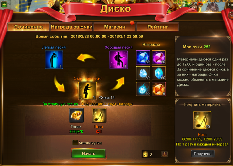 С 28 февраля по 1 марта весь Элизиум окунется в ритм «Диско»! Сочиняйте мелодии для крылатых красавиц и получайте ценные вещи, ресурсы и предметы события, которые можно обменять в магазине на наборы развития героев и редкие расходники. Лидеры рейтинга ивента, набравшие от 2000 очков, смогут получить мистические кристаллы, которые можно использовать в горячем событии «Мистический обмен».