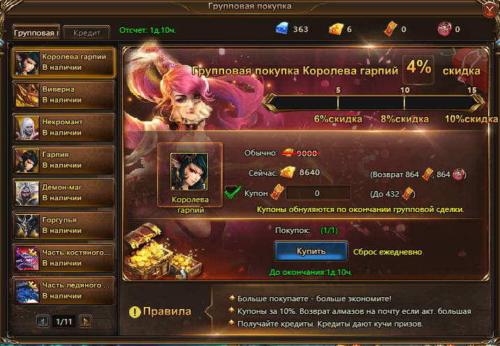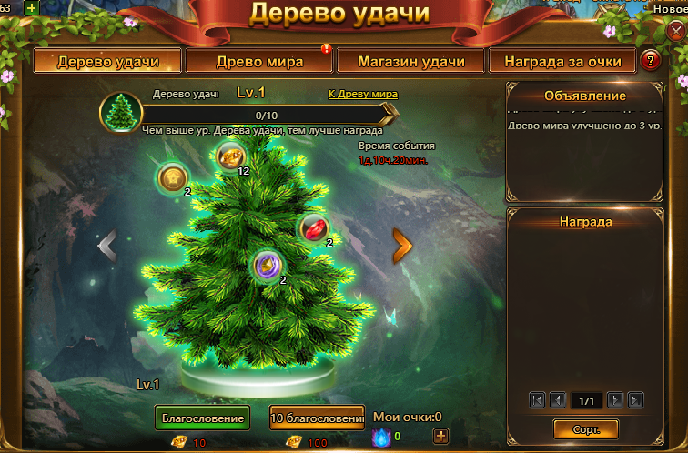 Благословляйте дерево водными эссенциями и получайте с его ветвей ценные предметы, редкие ресурсы и топазы. Магазин удачи так же готов радовать игроков. Вас ждут сильные прислужники Королева гарпий, Некромант, Горгулья, а так же души дракона, маунт и улучшенные руны.