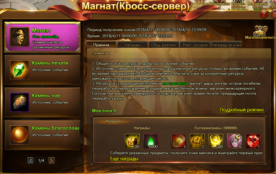 С 11 по 16 апреля копите ресурсы, получайте за них очки и поднимайтесь в рейтинге кросс-серверного «Магната»! Игроки, вошедшие в топ-50 рейтинга и набравшие от 300к очков, получат части королевы вампиров Эриды.