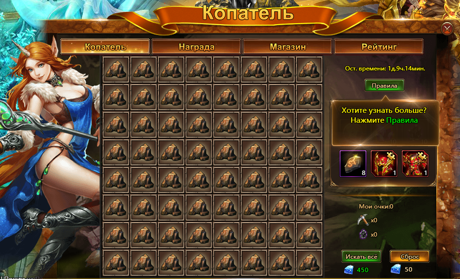 С 17 по 19 апреля для вас будет открыто событие «Копатель»! С помощью кирок или алмазов открывайте ячейки на игровом поле и получайте ценные ресурсы, части снаряжения и обсидиан, который можно обменять в магазине ивента.