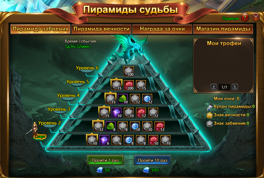 Уважаемые игроки, 18 и 19 апреля каждый из вас может испытать удачу и подняться на вершину «Пирамид судьбы». Соберите волю в кулак и поднимитесь на самую вершину пирамид! На каждом этаже вы получите ценные награды, в том числе знаки вечности и знаки забвения, которые можно обменять в магазине пирамиды на части артефактного оружия душ и части печатей для призыва ангельских маунтов.