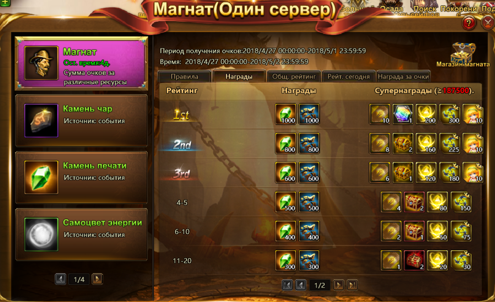С 27 апреля по 1 мая собирайте ресурсы, получайте за них очки и поднимайтесь все выше в рейтинге «Магната»! Тройка победителей события, набравших свыше 187500 очков, получат супернаграду — купоны события, ядра печати, части Убийцы душ и 10 частей милого питомца Сакуры, а лидеру рейтинга дополнительно достанется руна ЗАЩ-СТК 11-го уровня.