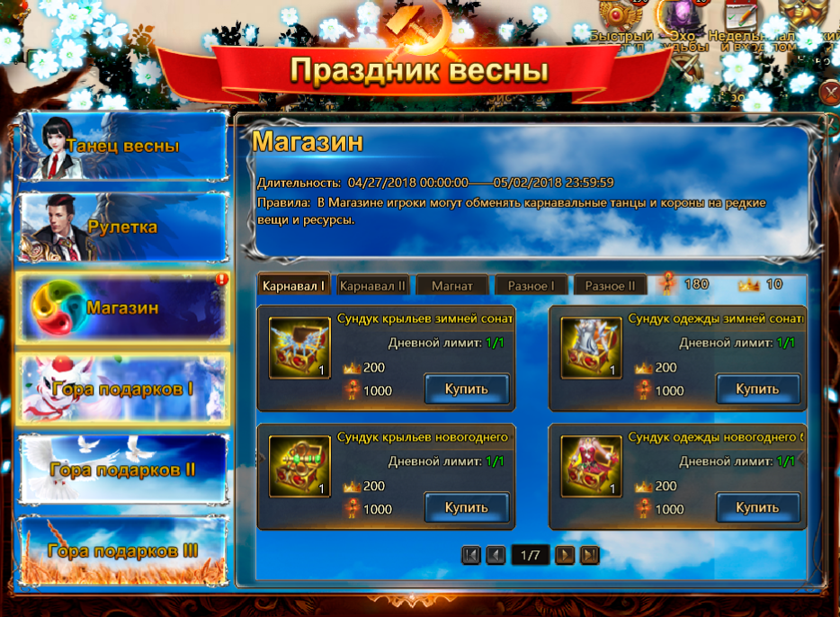 C 27 апреля по 2 мая получайте за выполнение заданий предметы события — праздничные маракасы, карнавальные танцы и короны, крутите фестивальное колесо и приобретайте в магазине самые красивые ангельские костюмы и ценные ресурсы, которые очень вам пригодятся, ведь сегодня начался односерверный «Магнат»!