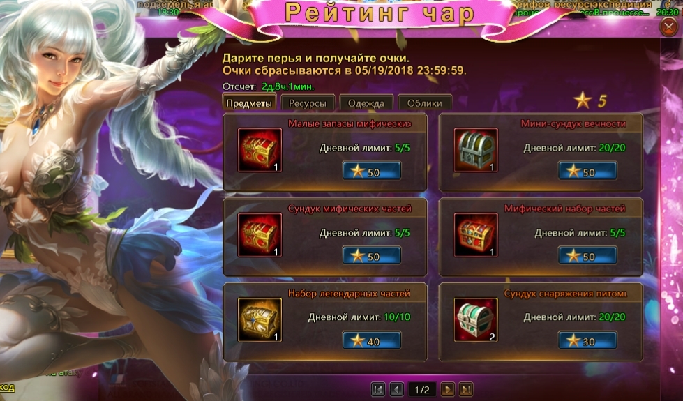 17 и 18 мая проводите рейды в Подземелье дворца, получайте волшебные ангельские перья и дарите их своим избранникам и избранницам в событии «Рейтинг чар». За подаренные перья вы будете получать ангельские звезды, которые можно обменять на ценные награды в магазине события.