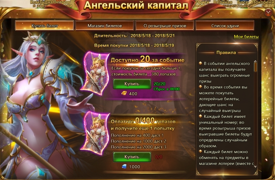В это же время, 18 и 19 мая, у вас есть возможность приобрести золотые билеты в событии «Ангельский капитал». Приобретенные билеты можно зарегистрировать в ангельской лотерее и обменять в магазине события на печати призыва маунтов, души дракона и мифические сундуки.