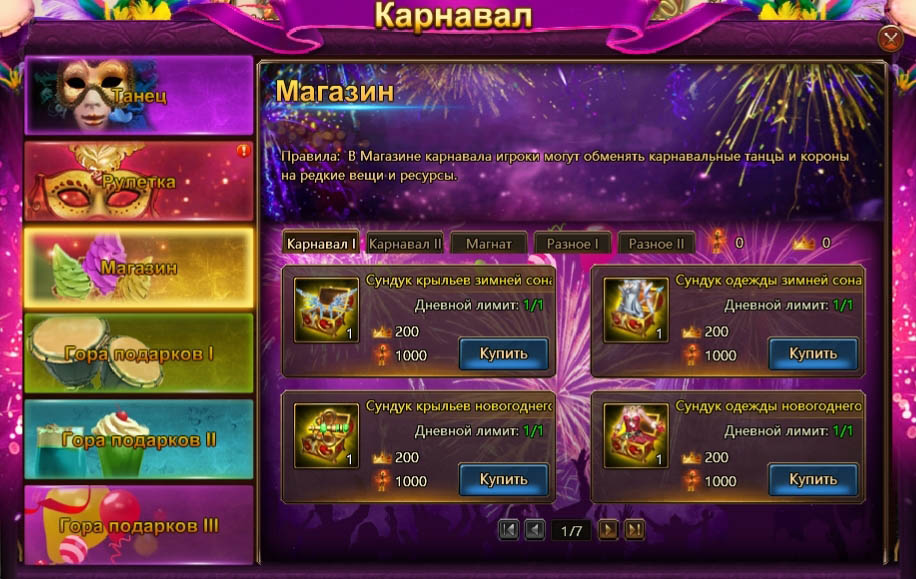 С 21 по 25 мая выполняйте задания события: вкладывайте топазы, тратьте алмазы, зачищайте элитные подземелья, крутите колесо фестиваля и получайте карнавальные танцы и короны. Их можно можно обменять в магазине на артефактные ангельские костюмы и ресурсы, которые помогут вам набрать недостающие очки в рейтинге «Магната»!