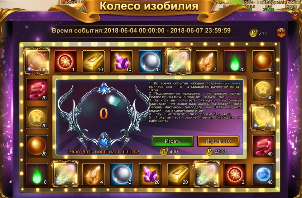 4 и 5 июня вы сможете испытать свою удачу в «Колесе фортуны»! В магазине события будут доступны печати призыва Рубинового дракона, Нефритового зайца, Дикоклыка и Бреанны, а также сундуки снаряжения маунтов и ресурсы для его прокачки.