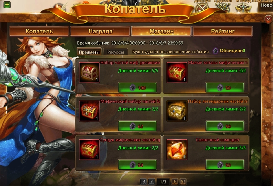 С 4 по 6 июня прекрасная Натали приглашает всех вновь отправиться на раскопки в грандиозном событии «Копатель». Участники, попавшие в топ-5 рейтинга ивента и набравшие от 3000 очков, получат особые мистические кристаллы, которые можно обменять на карты редких прислужников, ценные ресурсы и печати призыва самых сильных маунтов Элизиума — Магмадонта, Феникса, Турбокроля, Снежного барса.