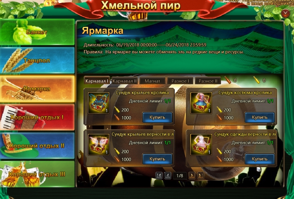 В это же время ангелы будут ждать вас на веселом празднике «Хмельной пир»! Собирайте особые крышки, а также обычный и королевский эль, крутите колесо фестиваля и посещайте ярмарку! В событии вас ожидают самые красивые ангельские костюмы, полезные ресурсы, которые позволят набрать очки в рейтинге «Магната», а также редкие расходники для прокачки печати и Священной грани — каждый найдет на фестивале что-нибудь интересное!