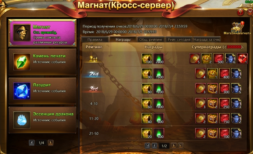 Уважаемые игроки, с 29 июня по 4 июля у вас есть возможность принять участие в кросс-серверном «Магнате». Собирайте ресурсы, получайте очки и поднимайтесь в рейтинге события. Игроки, вошедшие в топ-50 события и набравшие от 300к очков, получат части принца тьмы!