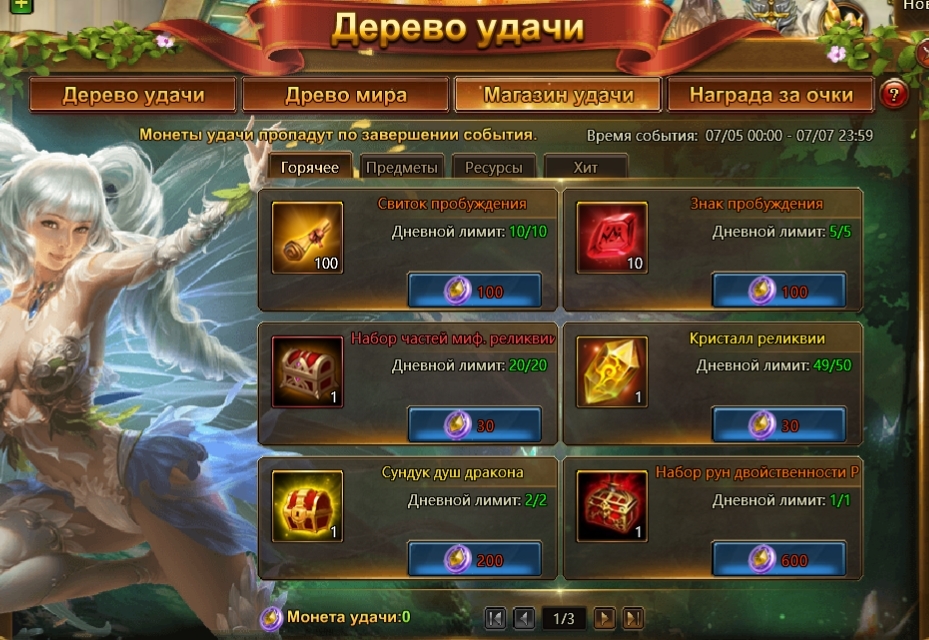 5 и 6 июля благословите волшебное «Дерево удачи» водными эссенциями и поймайте ценные предметы и ресурсы, которые упадут с его ветвей. Обратите внимание, что во вкладке «Хит» вас ждут печать золотой птицы Маюры, части Лулу, карты Некроманта и Демона-мага, сундук частей доблести и купоны, дающие 1 попытку прохождения подземелья Эха судьбы.