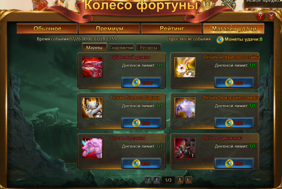С 26 и 27 июля проверьте свою удачу в «Колесе фортуны». В магазине события вас ждут ловкие маунты: Рубиновый дракон, Нефритовый заяц, Боевой баран, Бреанна, Дикоклык и Призрачный тигр.