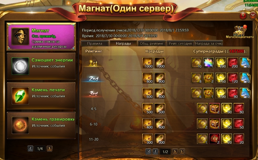 В это же время, с 30 июля по 3 августа, пройдет односерверный «Магнат». Собирайте ресурсы, получайте за них очки и поднимайтесь в рейтинге события! Игроки, попавшие в топ-3 рейтинга и набравшие от 187500 очков, дополнительно получат 10 частей артефактного питомца «Фрости».
