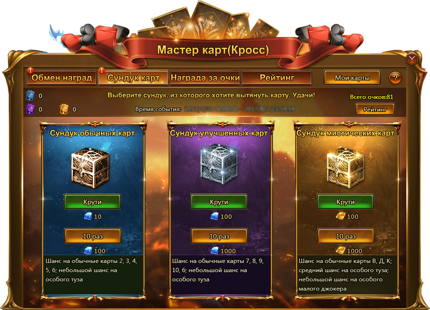 6 и 7 августа примите участие в кросс-серверном «Мастер карт», соберите необходимые вам карточные комбинации и обменяйте их на ценные предметы и полезные ресурсы. Участники, попавшие в топ-10 рейтинга и набравшие от 3000 очков, получат карты мощного прислужника Морозного гиганта!