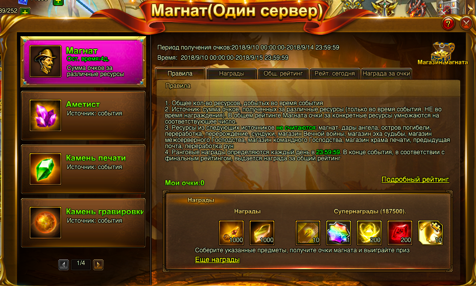 С 10 по 14 сентября у вас есть возможность принять участие в Односерверном «Магнате». Собирайте ресурсы, получайте за них очки и поднимайтесь в рейтинге события. Победителей ждет достойная награда!