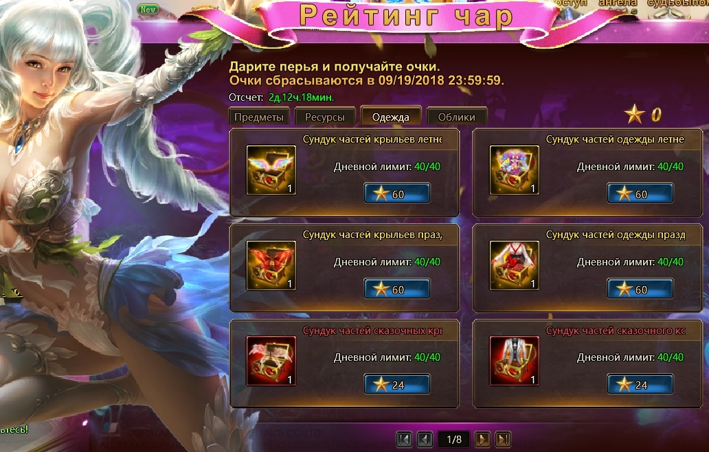 17 и 18 сентрября для вас будет доступно событие «Рейтинг чар». Получайте золотые звезды, которые можно обменять в магазине события на части ангельских нарядов «Летняя фантазия», «Праздник призраков» и «Сказочный костюм». Кроме этого, у вас есть возможность собрать облики на королеву севера Изольду, цветочного ангела Флору, целительницу Аишу и многих других героев!