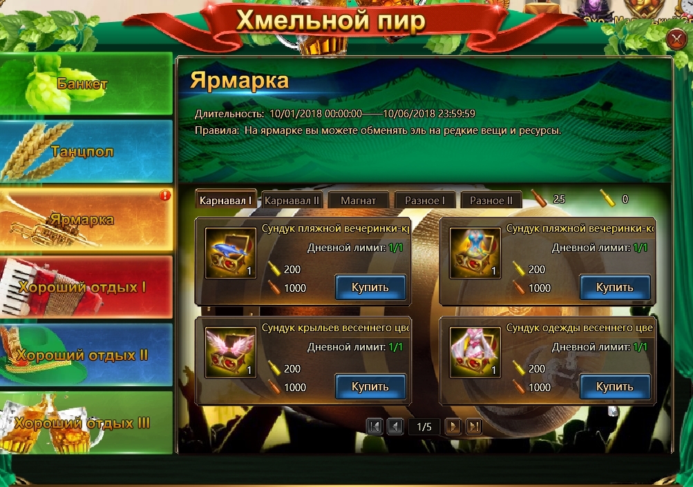С 1 по 5 октября участвуйте в фестивале «Хмельной пир». Выполняйте задания события — зачищайте элитные подземелья, тратьте алмазы, вкладывайте топазы, вращайте колесо — и получайте королевский и обычный эль, который можно обменять в магазине. Набейте сундуки ценными ресурсами и получите очки рейтинга «Магната»!