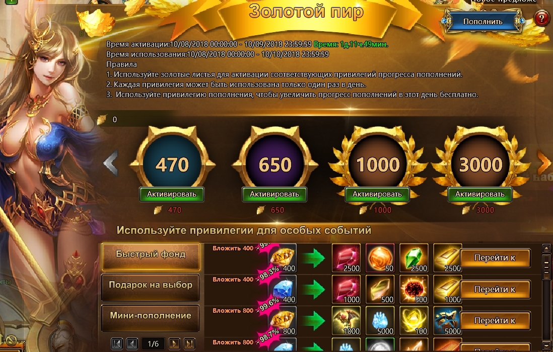 И это еще не все! 8 и 9 октября у вас есть шанс принять участие в событии «Золотой пир»! Пополняйте игровой счет и получайте волшебные золотые листья, активируйте один из бонусов события и получите соответствующий прогресс пополнения в горячих событиях. Каждый из бонусов можно активировать только один раз. Список горячих событий, участвующих в этой акции, можно посмотреть в окне «Золотого пира» — все они отмечены иконкой золотого листа.