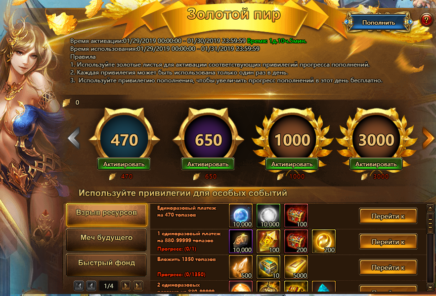 С 29 по 31 января крутите «Колесо фортуны» за алмазы или топазы и получайте полезные ресурсы для прокачки! Также вращения колеса дают специальные монетки, за которые вы сможете приобрести рубинового дракона, печать нефритового зайца, печать призрачного тигра и многое другое!