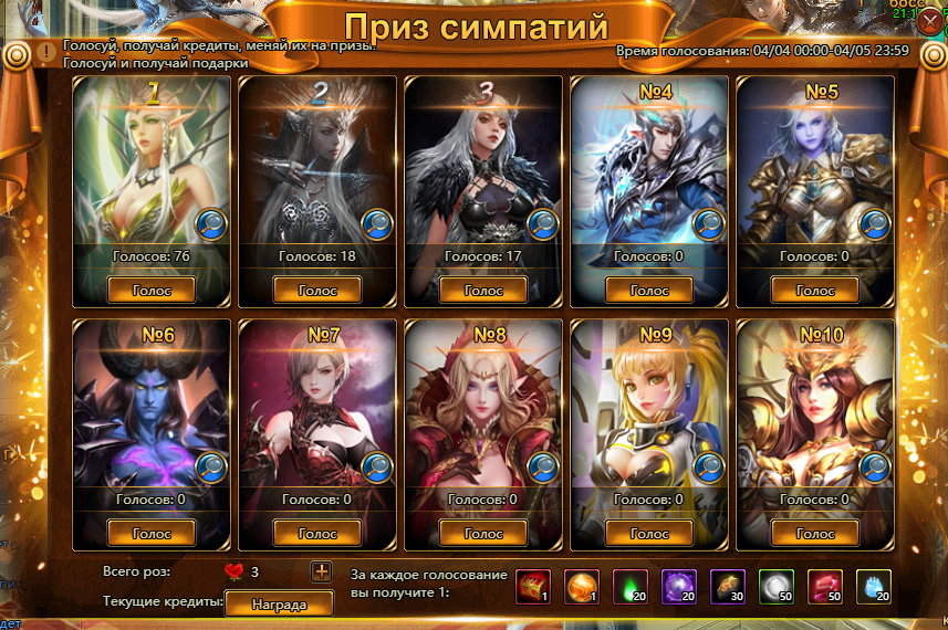Герои, пришло время выбрать нового любимчика Элизиума! 4 и 5 апреля посетите «Приз симпатий» и выберите ангела, который покорил ваше сердце. Устраивайте рейды и получайте за это розы, за которые можете приобрести голос в пользу вашего фаворита. Каждый голос принесет вам награды!