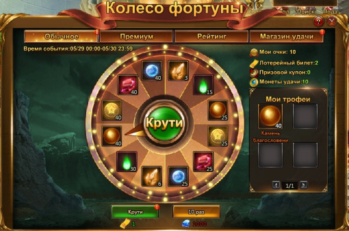 10 прокруток за 1000 топазов принесут 100 монет удачи и 100 очков.