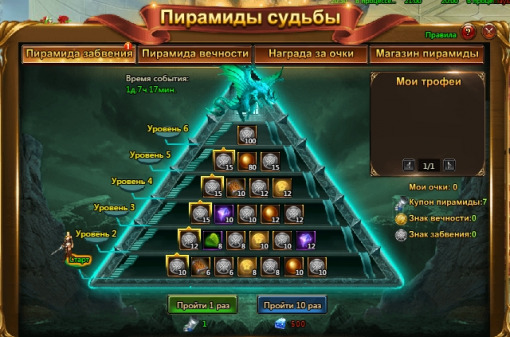 Для того, чтобы проходить пирамиду, вам понадобятся “Купоны пирамиды”. Получить их можно в Событиях.
