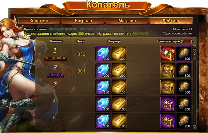 По итогам ивента, десять самых активных копателей получат особые награды, соответствующие их заслугам — Золотые слитки и Камни очистки. А при достижении отметки в 3000 очков и выше, еще и крутейшие сундуки с горами Камней чар. За это стоит побороться!
