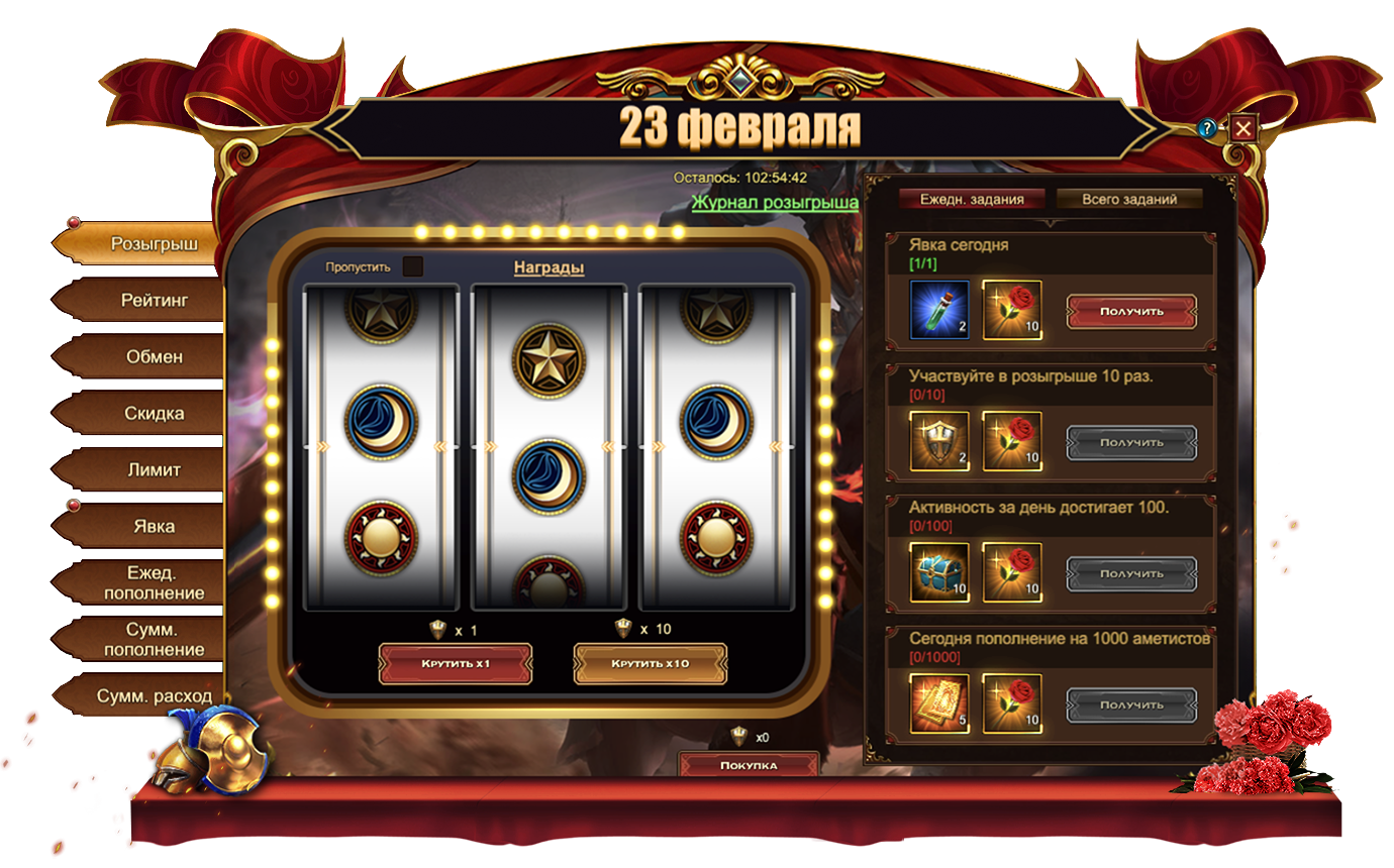 Участвуйте в розыгрыше различных ценных предметов, чтобы получить: Рутил, Чароит, Мрачные одежды, Сундук кристаллов 5 ур., Кристалл чар демона, Кольцо господства, Свиток славы, Кристалл души крыльев, Сундук самоцветов 8 ур., Щит Нидхегга, Фрагмент голубого пера и даже Крылья купидона!