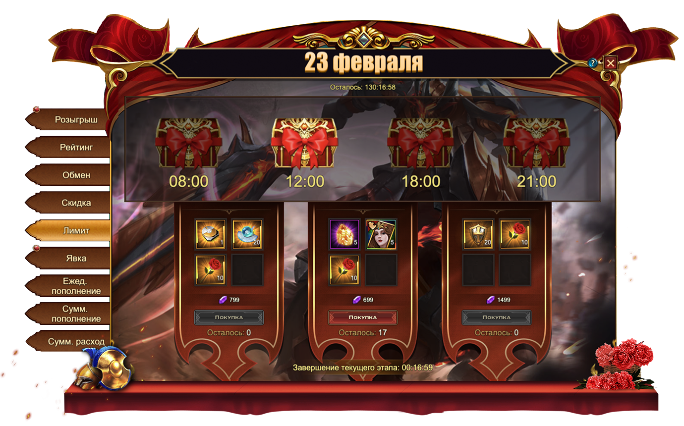 Букеты, собранные во время данного Фестиваля, позволяют приобрести множество интересных предметов, в том числе и эксклюзивных для данного события: [Карта] Фригг, титул Заступник Отечества[Аватар] МаршалРамка 23 февраля. Если эксклюзивные предметы вас не интересуют, всегда можно обменять Букеты на полезные ресурсы. Например, на Таинственный камень, [Бог чести] Фенрир и Отличный дракоша
