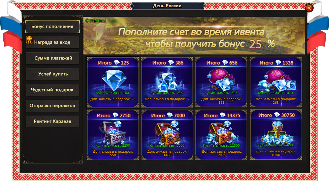 С 12:00 6 июня по 12:00 13 июня по московскому времени пройдет акция «Бонус пополнения». В период действия специального предложения приобретайте алмазы и получайте дополнительный 25%-й бонус к выбранной сумме!