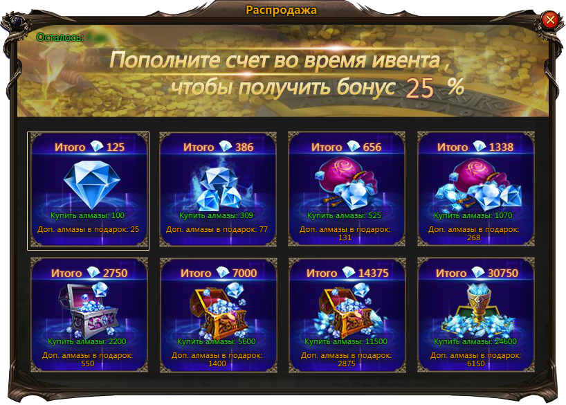 В рамках данной акции при приобретении алмазов у вас есть шанс занять почетное место в специальном рейтинге и стать обладателями множества призов. Кроме того, при пополнении счета на 500 и более алмазов за один день вы сможете получить набор с ценными наградами.