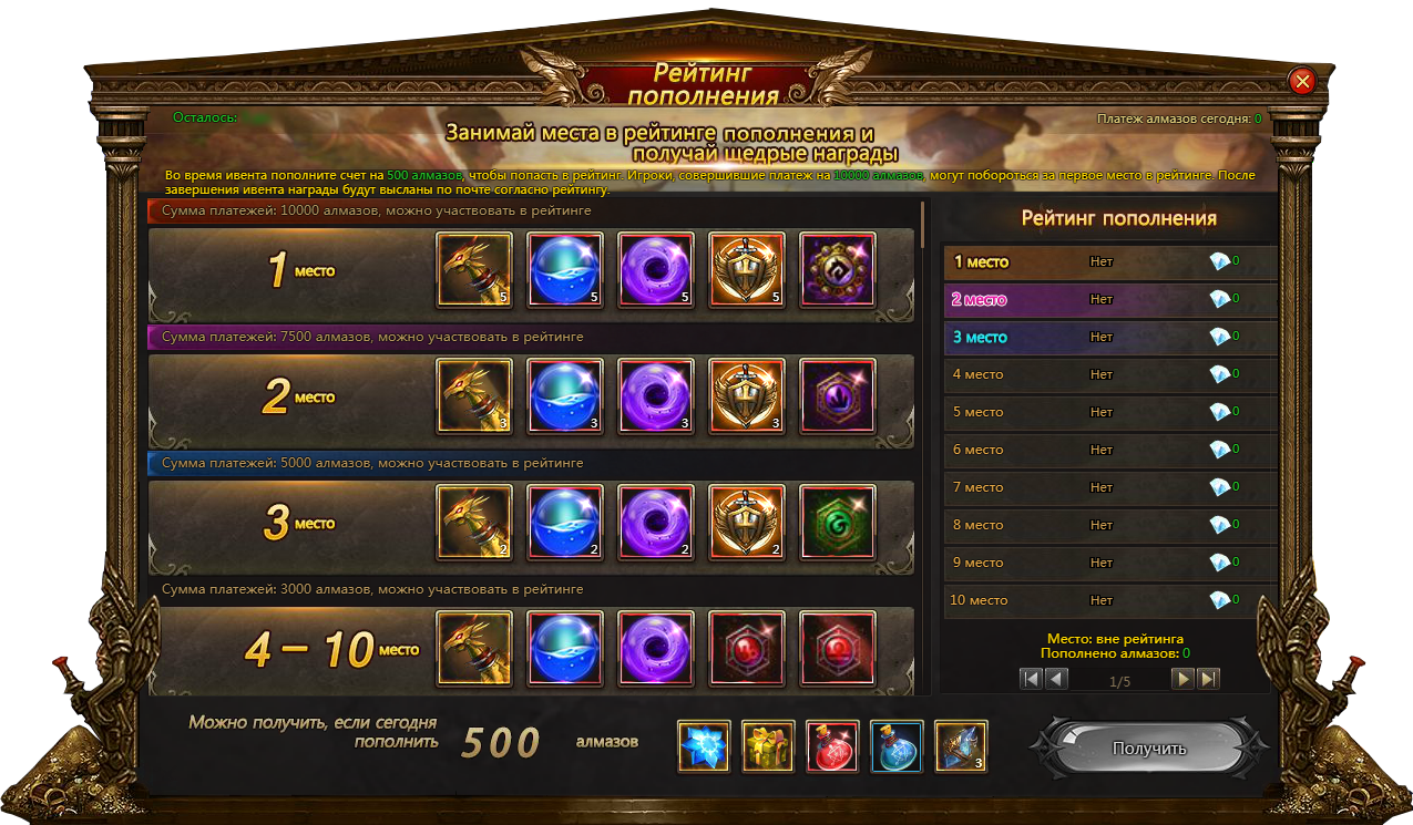 Обратите внимание, что событие является межсерверным. Рейтинг формируется в зависимости от суммы пополнений участников. По завершении события призы за рейтинг будут отправлены на внутриигровую почту.
