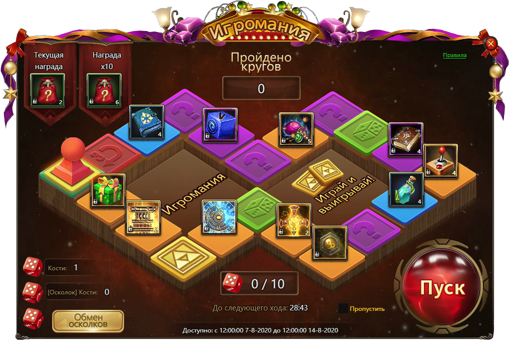 Участвуйте в событии «Игромания» – бросайте кости, перемещайтесь по игральной доске и получайте призы. Испытайте удачу, и пусть улыбка Фортуны принесет вам множество призов!