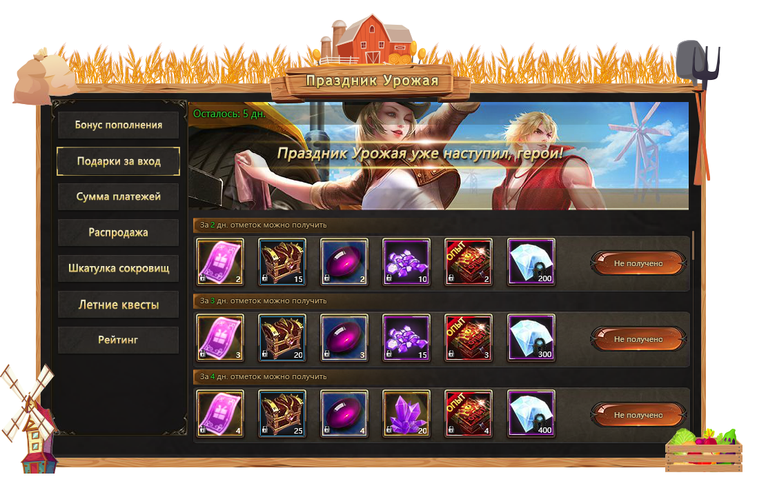 Заходите в игру в течение 7 дней и получайте награды. Соберите все подарки праздничного фестиваля!