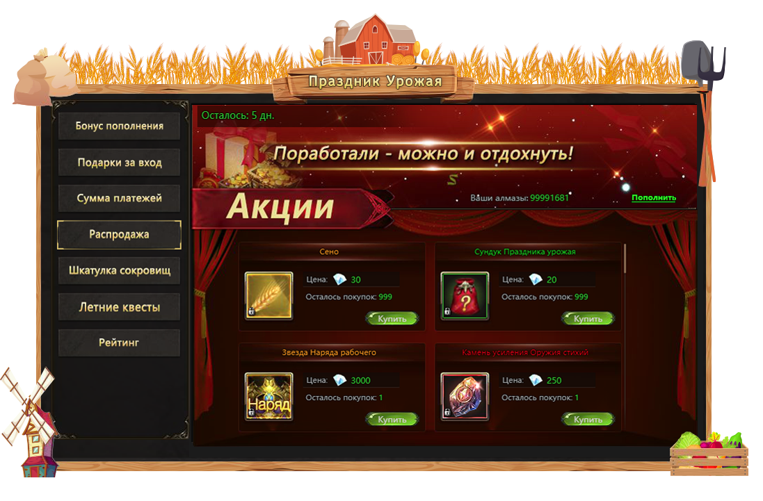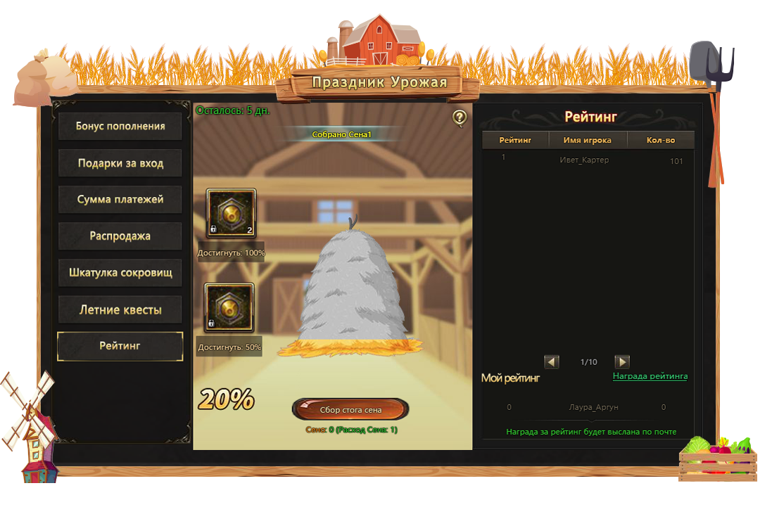 Мы трудились все лето, вырастили много-много вкуснейших овощей и фруктов, так что же теперь, герои? Настало время от души повеселиться на Празднике Урожая! Отложите в сторону инструменты, позовите всех друзей на торжество и приготовьтесь к самой большой вечеринке этого лета. Уже завтра, 7 августа, в 12:00 по московскому времени в игре стартуют праздничные события с разнообразными ивентами и акциями, также будут запущены активности «Игромания» и «Омут желаний». Мероприятия продлятся до 12:00 14 августа по московскому времени.